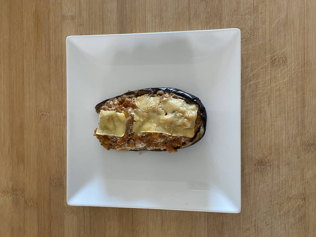 - Rellenamos las berenjenas con la mezcla, las colocamos en una bandeja de horno y cubrimos con bechamel y queso vegano.